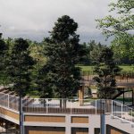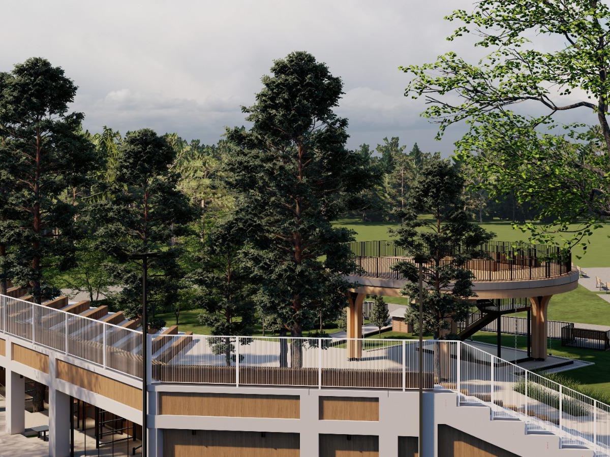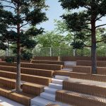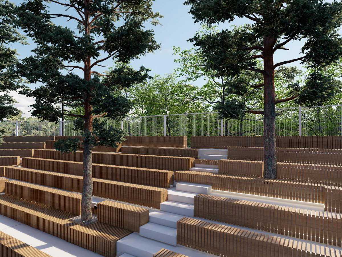 Organizarea spațiilor exterioare include dezvoltarea unei zone pavate care leagă cele două structuri, servind ca zonă de primire și acces pietonal. În plus, căile pietonale sunt proiectate pentru a facilita conexiunile între diferitele zone funcționale, folosind materiale de pavaj durabile și estetice, care se integrează armonios în peisaj. Spațiile de sub scaunele amfiteatrului vor fi utilizate pentru activități fizice în aer liber.